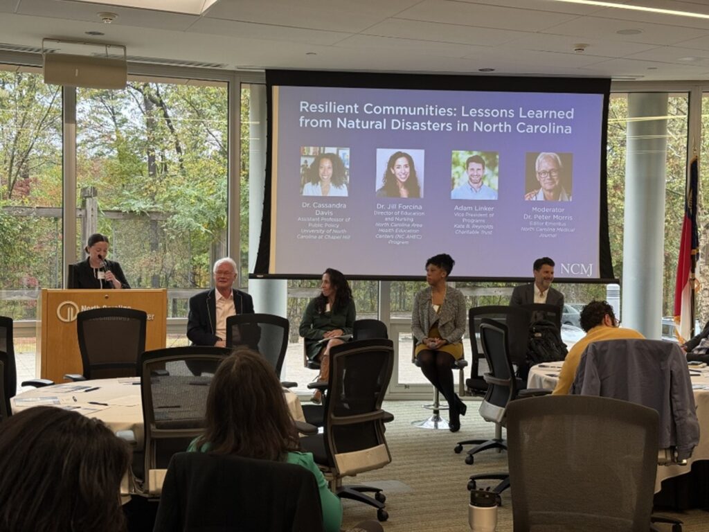 On October 27, 2025, the NCMJ team hosted a symposium to explore the Journal’s first issue of the year, which focused on disaster relief and collaborative approaches to navigating health, data, and community recovery. The NCMJ symposium, “Navigating Disaster Relief,” offered attendees the opportunity to reflect on recent natural disasters in North Carolina and discuss opportunities to improve preparedness and recovery efforts.